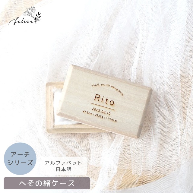 へその緒ケース 【 アーチ 】 お子様とつながっていた証の ” へその緒 ” を 大切にしまっておけるケースです アーチ状にメッセージが入っています オーガンジーの巾着に入れてお届けしますので、 そのままプレゼントとしてお渡しもできます 刻印するメッセージをご選択いただき、 必要事項①~③を備考欄にご記入の上ご注文下さい 全ての情報が揃ってからの製作となります 不備があり3日以上ご連絡がつかない場合、 恐れ入りますが一度キャンセルとさせていただきます ◆サイズ ﹌﹌﹌﹌ 横 約8cm × 縦 約5cm ◆商品について ﹌﹌﹌﹌﹌﹌﹌ 以下より刻印する文章をお選びください (1)Thank you for being born.「うまれてきてくれてありがとう。」 (2)You are my treasure.「あなたは私の宝物。」 ※※※ 備考欄にご記入の上ご注文下さい。 以下をコピーしていただくとスムーズです ①お名前( 漢字 / アルファベット ) 例:yui / 大翔(はると) ※ アルファベットはいただいた通りのつづりでのおつくりとなります ※ふりがなは必要な方のみ ②生年月日※ご入力いただいた通りにお作り致します 例:2023.04.26 / April 26th , 2023 ③(お入れしたい方のみ)身長・体重・出生時間 am / pmまで ※ 身長・体重・出生時間は無しも可能です ※ 時間は12時間表記となります 12:00am → 夜中の12時 12:00pm → お昼の12時 ※ 漢字の場合はおふりがな対応可能です 漢字の後にひらがなをお入れください 有料オプション(+500円)で裏面にメッセージを刻印できます 名前の由来、お子様へのメッセージ、生まれた場所、ご両親のお名前等、 30文字程度まで可能です ご希望の方は有料オプションをご選択いただいた上で備考欄にご記入ください ※ 文字数により、二段~三段になる可能性がございます 桐箱はとても繊細な商品です 大変傷がつきやすいので、お取り扱いには十分ご注意ください 自然の木目の商品ですので、色や模様に個体差がございます 予めご了承ください
