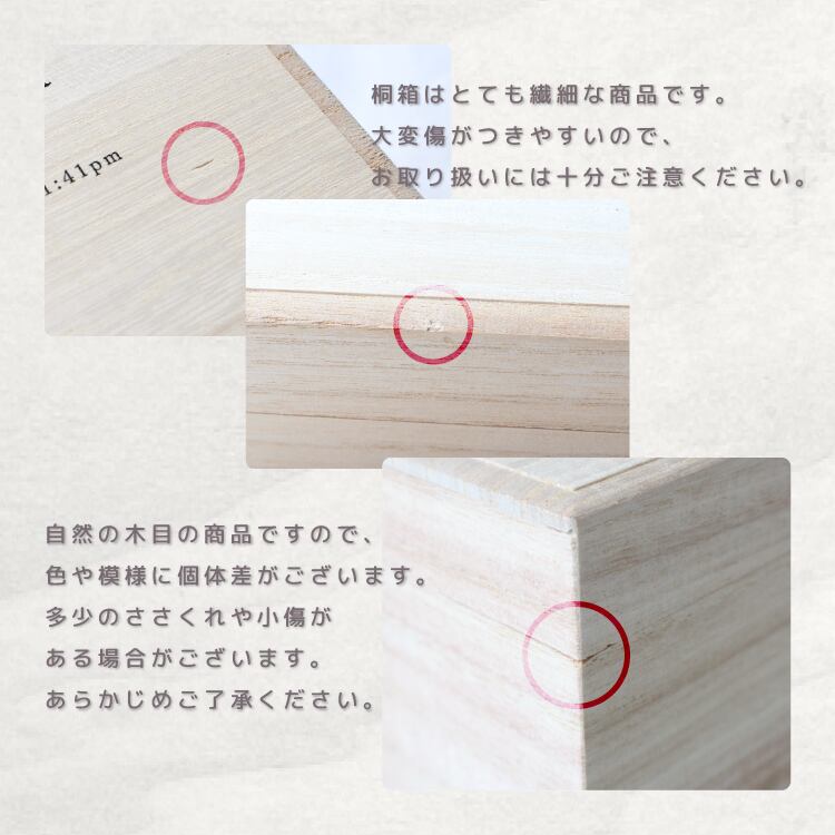 桐箱に直接印刷しているため、表面の凹凸によりインクがのらない個所やかすれのようになってしまう場合がございます。