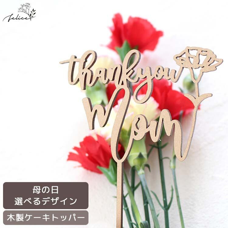 【母の日】 ThankyouMom ケーキトッパー 木製 カーネーション おしゃれ ウッド かわいい ギフト 飾り 装飾